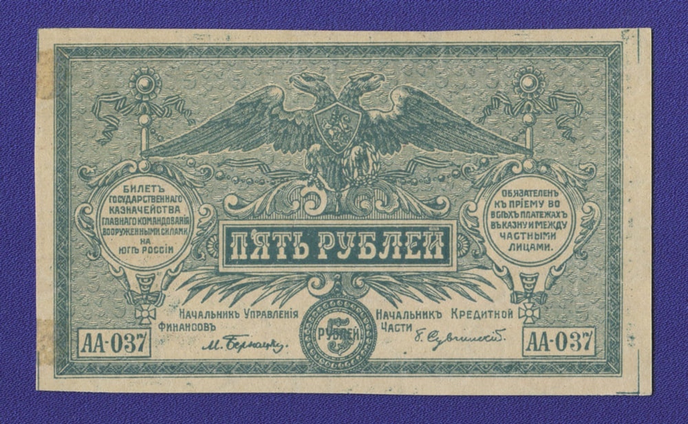В нашем интернет-магазине BONUMAN вы можете купить банкноту Гражданской войны (Юга России) выпущенную в 1920 году, номиналом 5 рублей.