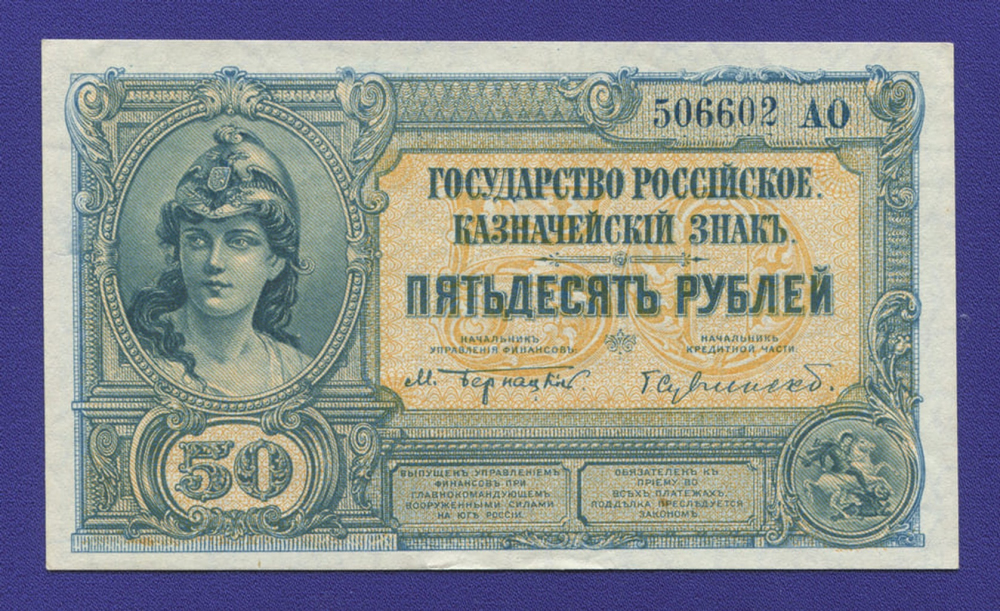 В нашем интернет-магазине BONUMAN вы можете купить банкноту Гражданской войны (Юга России) выпущенную в 1920 году, номиналом 50 рублей.