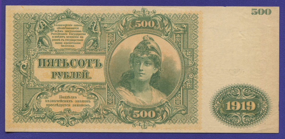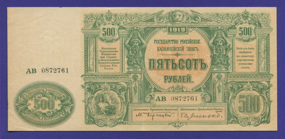 В нашем интернет-магазине BONUMAN вы можете купить банкноту Гражданской войны (Юга России) выпущенную в 1919 году, номиналом 500 рублей.