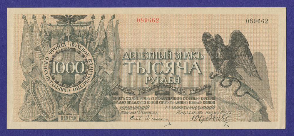 В нашем интернет-магазине BONUMAN вы можете купить банкноту Гражданской войны (Северо-Западной России) Юденича выпущенную в 1919 году, номиналом 1000 рублей.