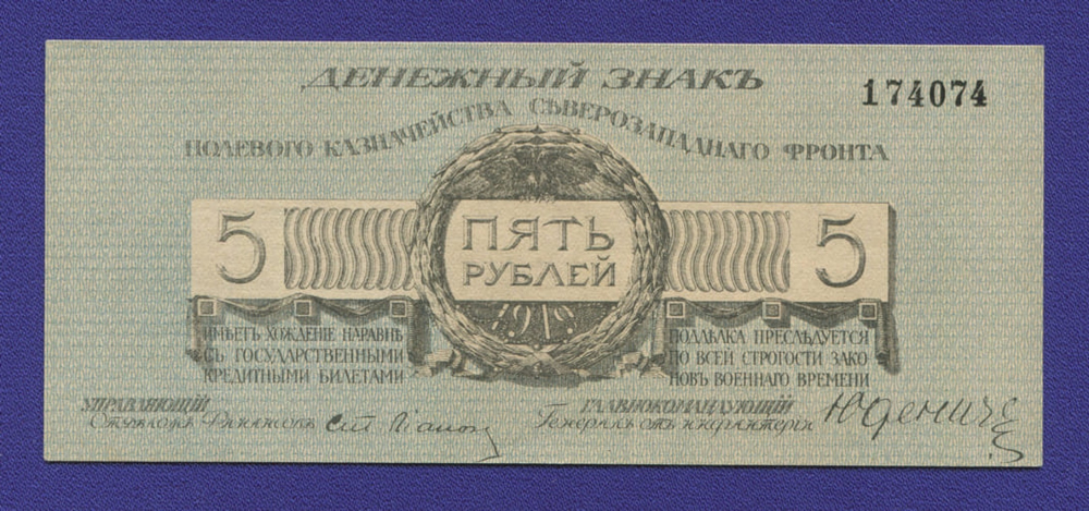 В нашем интернет-магазине BONUMAN вы можете купить банкноту Гражданской войны (Северо-Западной России) Юденича выпущенную в 1919 году, номиналом 5 рублей.