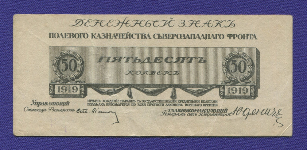 В нашем интернет-магазине BONUMAN вы можете купить банкноту Гражданской войны (Северо-Западной России) Юденича выпущенную в 1919 году, номиналом 50 копеек.