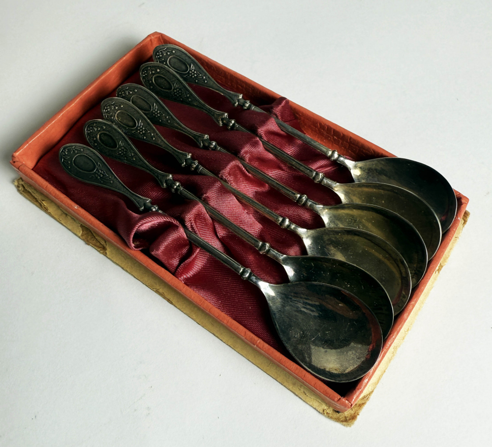 Ложки в подарочной коробке. Мельхиор. Клеймо 6ЮМ МН-19.