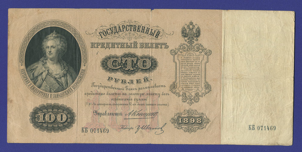 В нашем интернет-магазине BONUMAN вы можете купить банкноту Николая II выпущенную в 1898 году, номиналом 100 рублей.