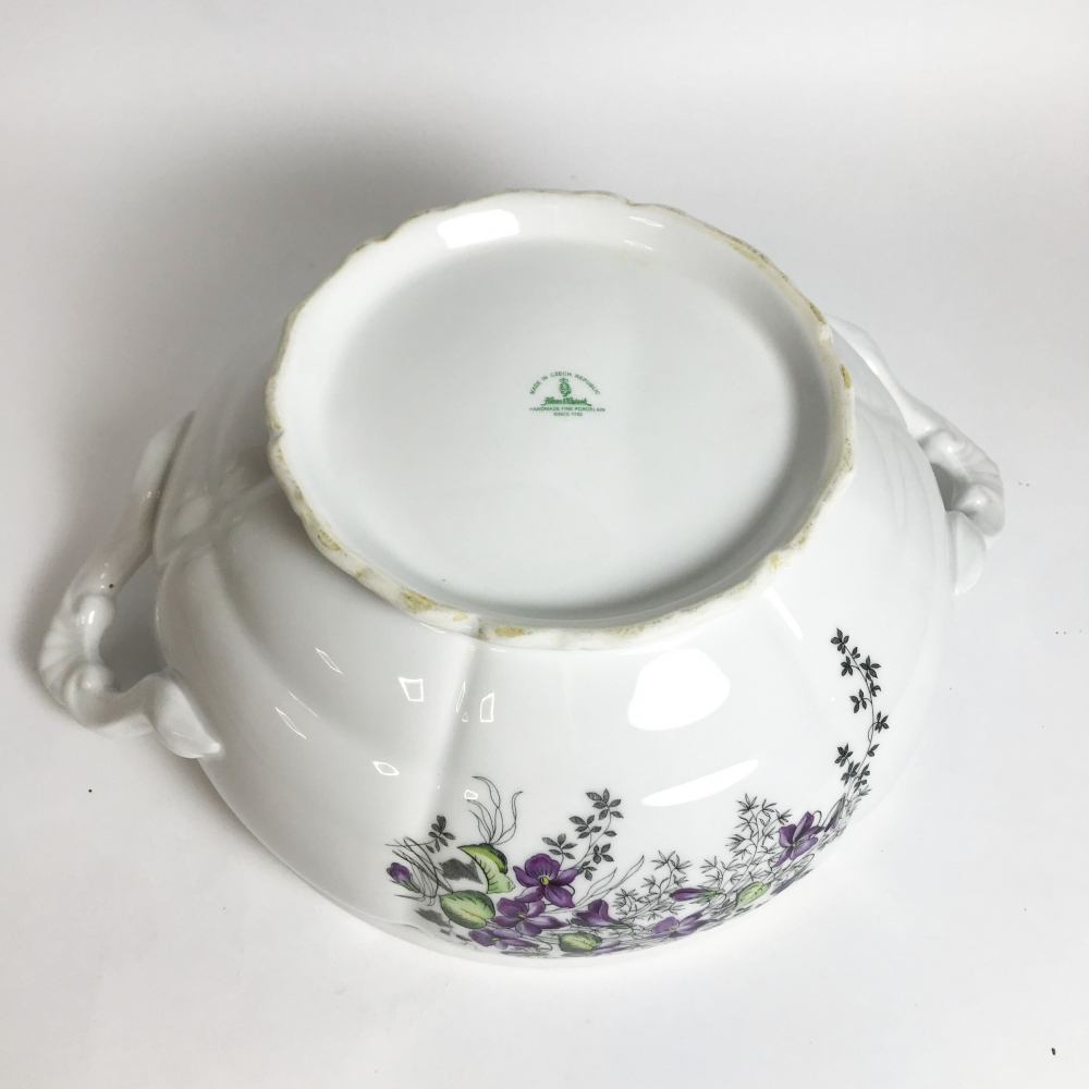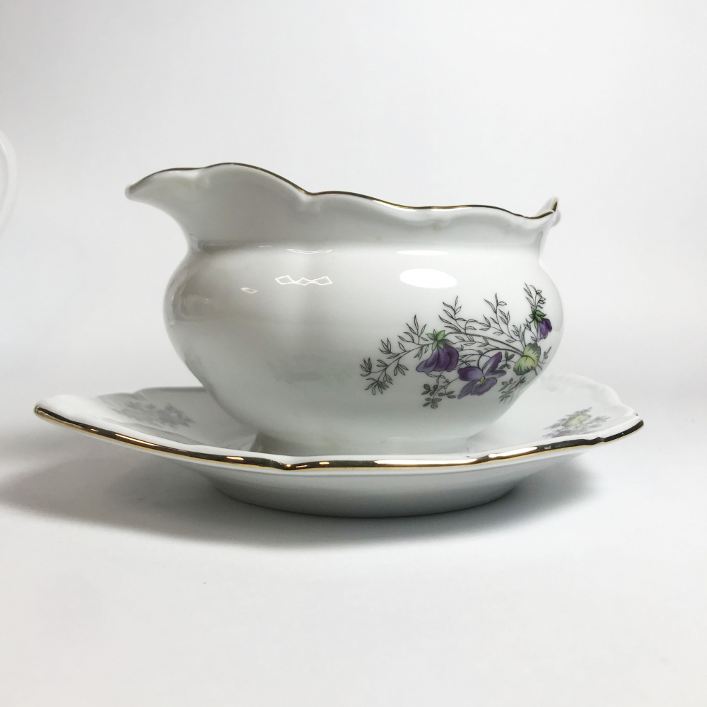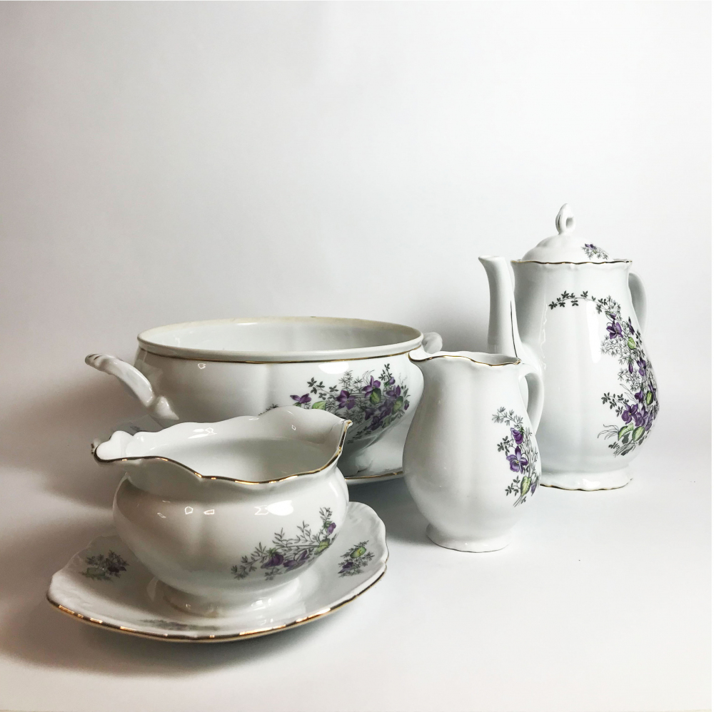 Сервиз включает в себя соусник, молочник, графин с крышкой, супница ( без крышки ), блюдо.